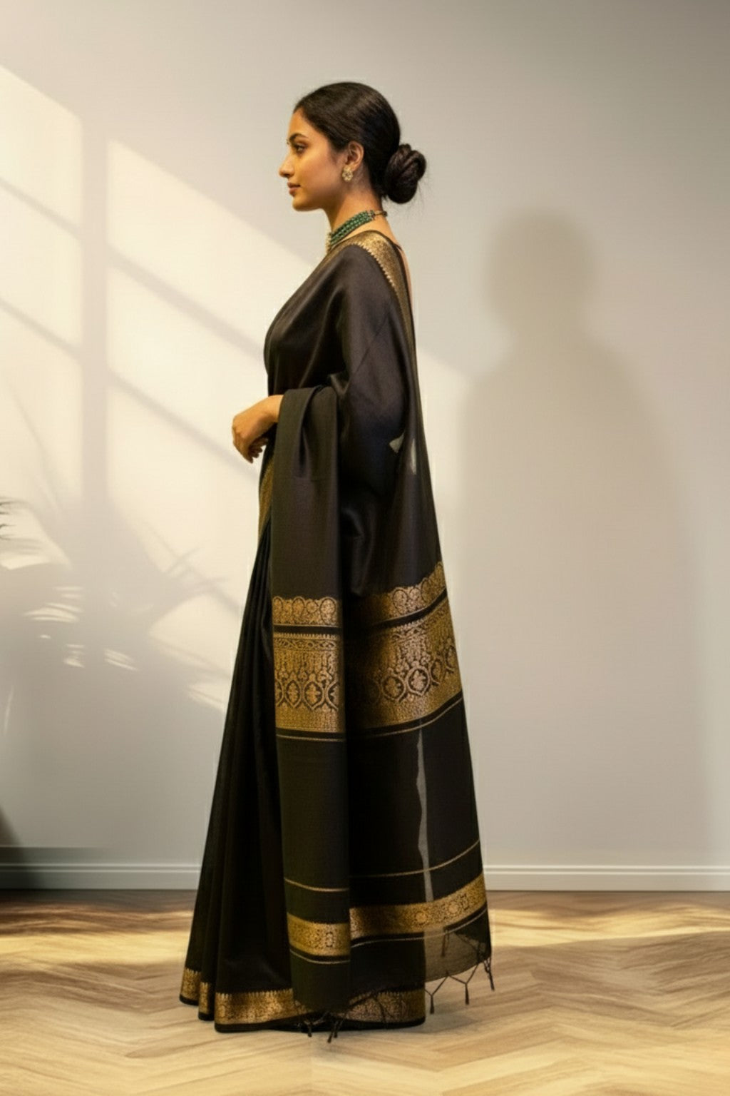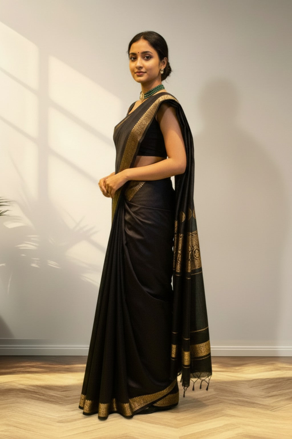 Fabric: Cotton Silk Blend Color: Deep Black with Subtle Golden Border Texture: Smooth with a gentle silk sheen Look: Elegant, rich & timeless Use: Ideal for sarees, blouses, ethnic wear, and festive ensembles