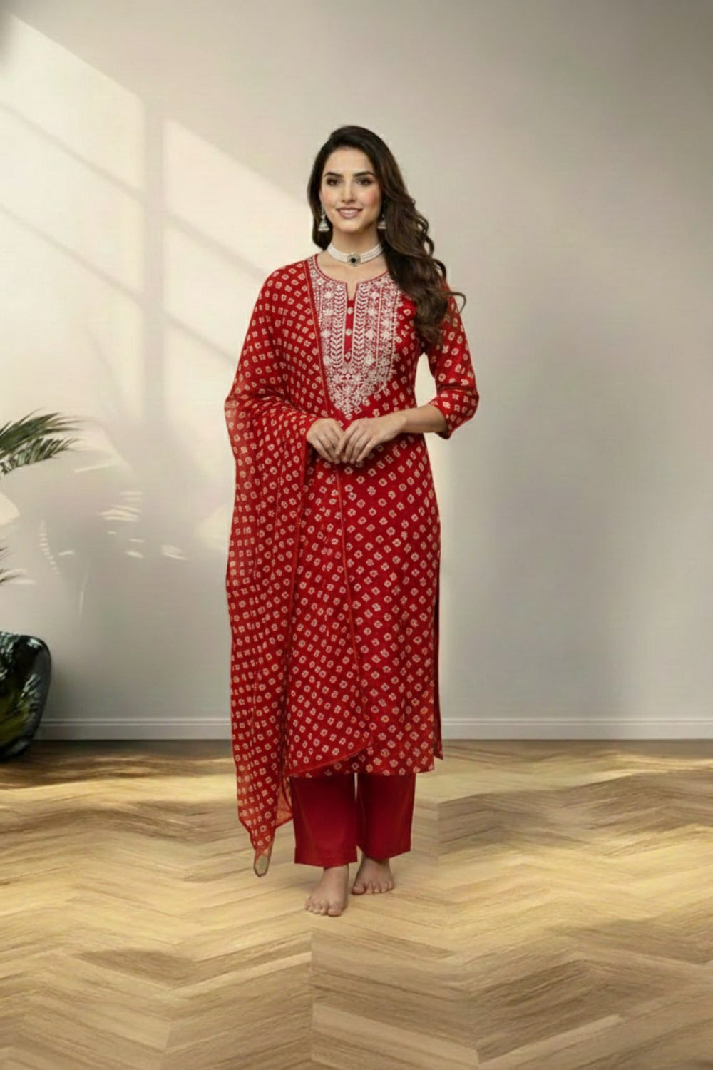 This elegant red cotton kurti set features a stylish boat neckline and intricate butta Bandhani work that adds a rich traditional charm. The highlight of this ensemble is the heavy zari embroidery on the chest, crafted in an ornate pattern that elevates its festive and sophisticated appeal. Made from soft, breathable cotton, this kurti set ensures all-day comfort while maintaining a refined ethnic look—perfect for celebrations, special occasions, or graceful everyday wear.