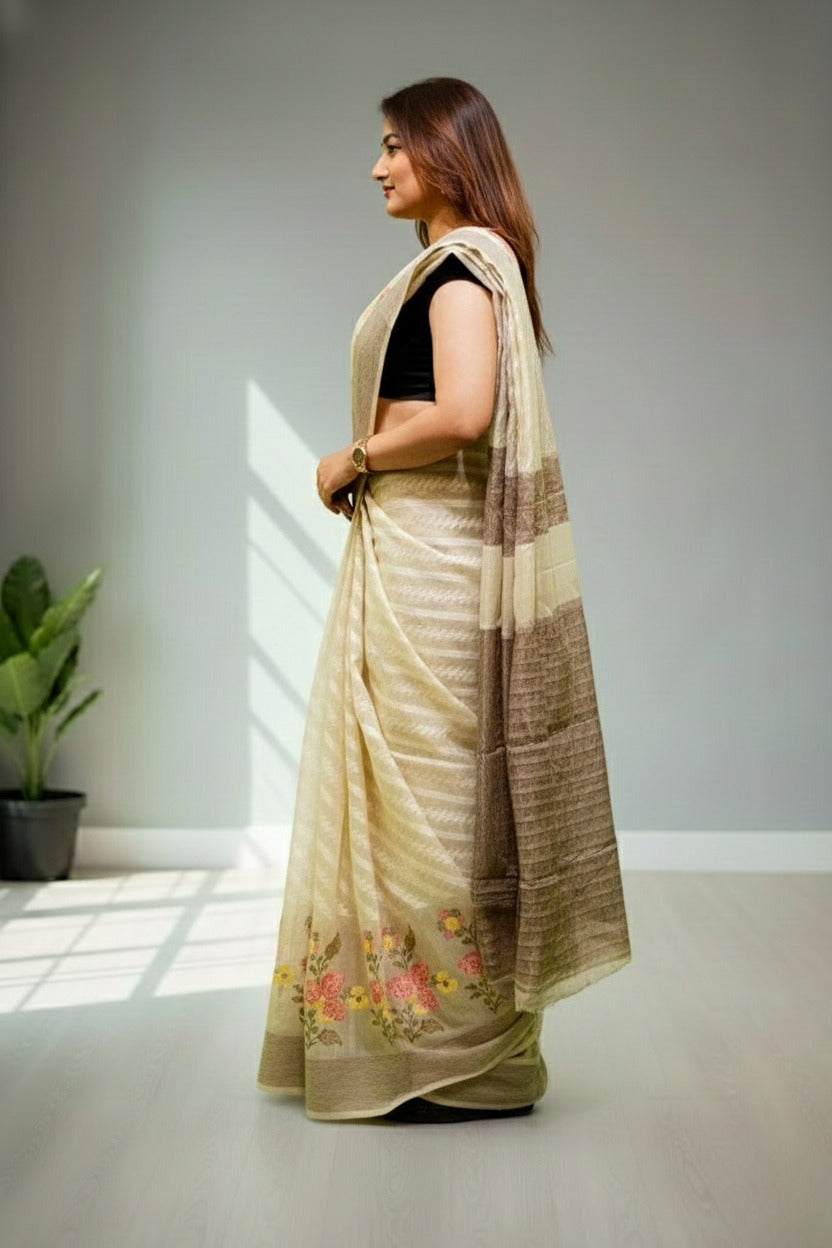 An elegant cream Chanderi silk saree highlighted with delicate machine-embroidered floral motifs placed gracefully near the border line, creating a refined and subtle appeal. The border is enhanced with light brown geometric weaving work, adding gentle contrast and understated detailing. With its soft sheen and lightweight texture, this saree perfectly balances simplicity and sophistication.