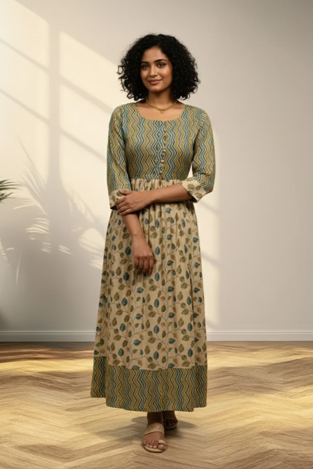 This elegant long kurti dress in a breathable cotton blend fabric features a distinctive horseshoe neckline and a front opening with button detailing. The gathered waist adds graceful volume, while the floral print at the skirt hem offers a beautiful and feminine finish.