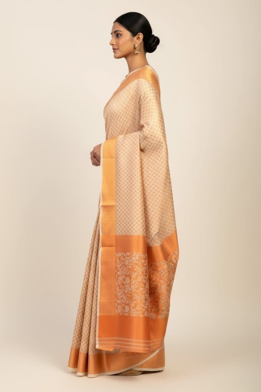 The subtle golden beige hue paired with luxurious zari work makes this saree a versatile piece that blends tradition with timeless sophistication.