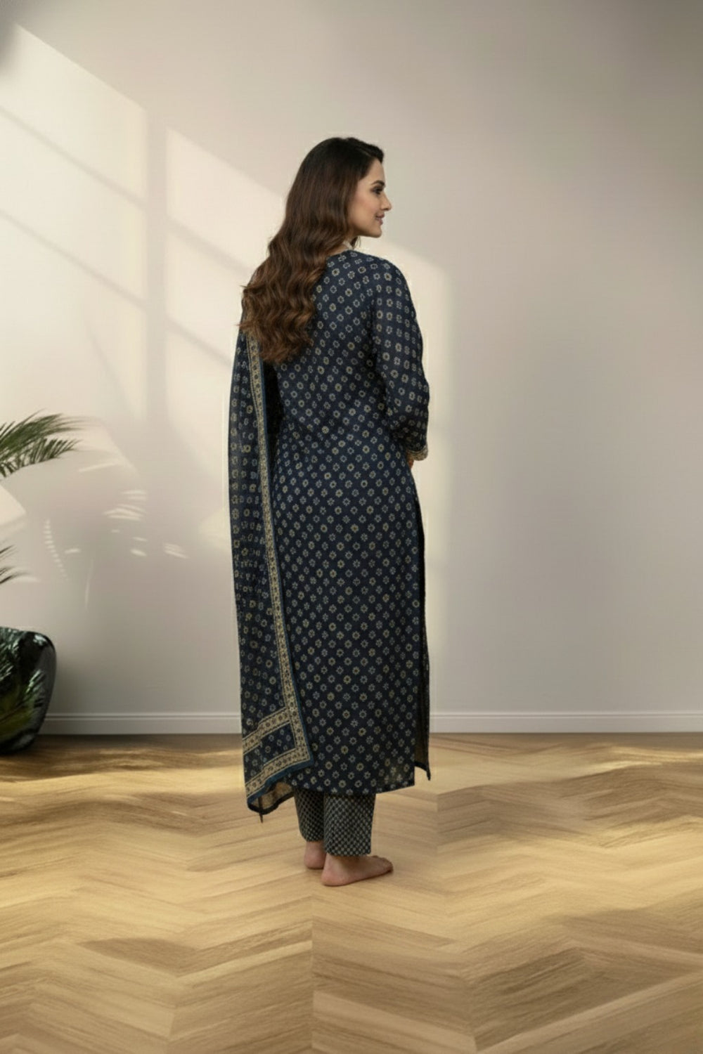 Step into contemporary elegance with this cotton kurti set, featuring a bold dark green and blue color palette. The striking geometric patterns lend a modern and stylish edge, while the breathable cotton fabric ensures lasting comfort throughout the day. Perfect for casual outings or smart everyday wear, this design blends effortless style with refined ease.