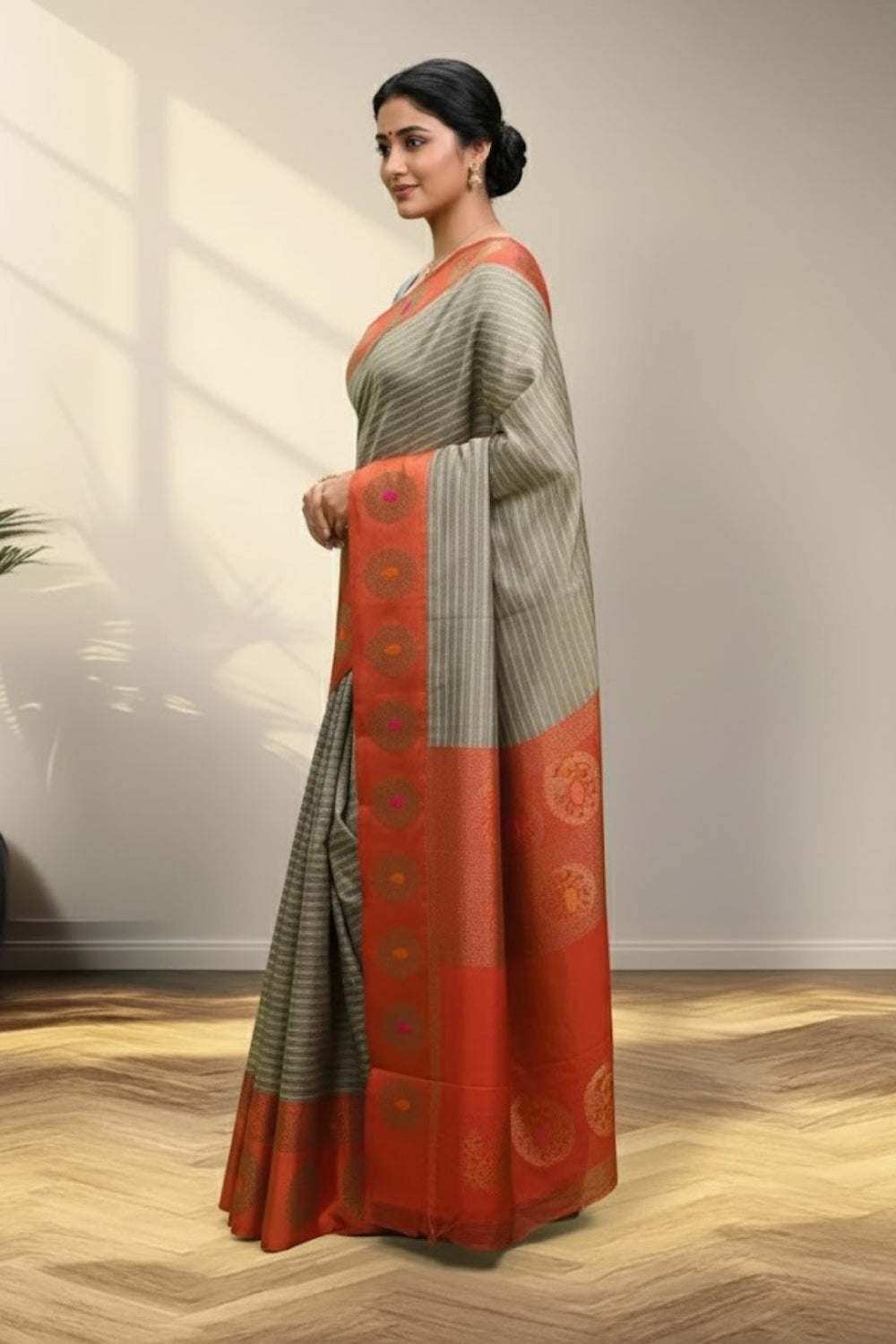 This contemporary artistic handloom silk saree seamlessly blends traditional elegance with modern aesthetics. The subtle grey and black striped body lends a minimalist and sophisticated charm, beautifully contrasted by a striking red-orange border and pallu. Accents of gold-copper Zari motifs add a festive richness to the overall design, making it an exquisite choice for both cultural and formal occasions.