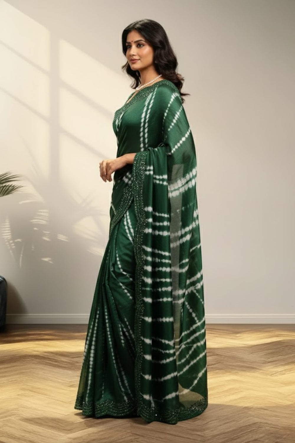This striking green Bandhani saree features traditional tie-dye patterns in white, forming visually captivating diagonal and vertical designs across the fabric. Crafted from soft, flowy crepe, the saree drapes effortlessly, enhancing its elegant appeal. The standout element is its embellished border, adorned with mirror work and delicate detailing, adding sparkle and depth—perfect for festive or semi-formal occasions.