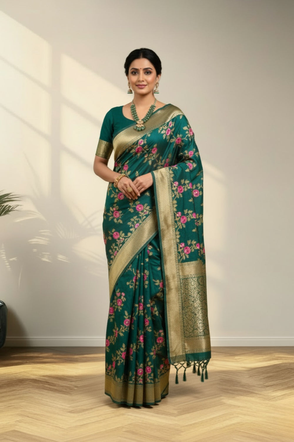 An elegant dark green Banarasi saree adorned with intricate heavy floral zari weaving, exuding a rich and timeless traditional charm.