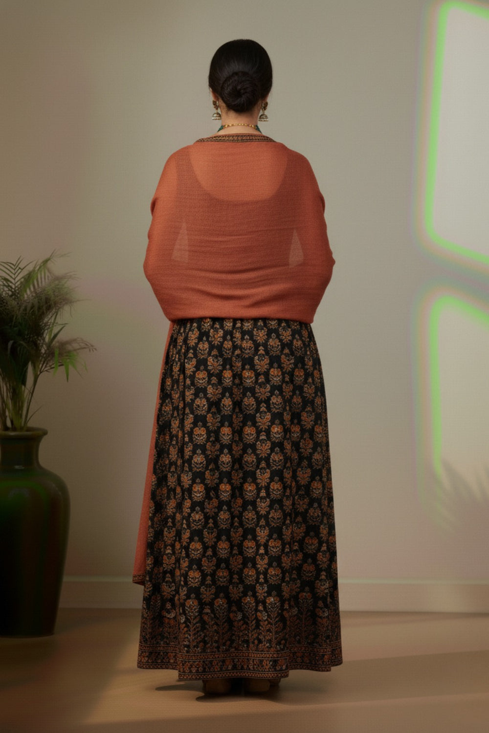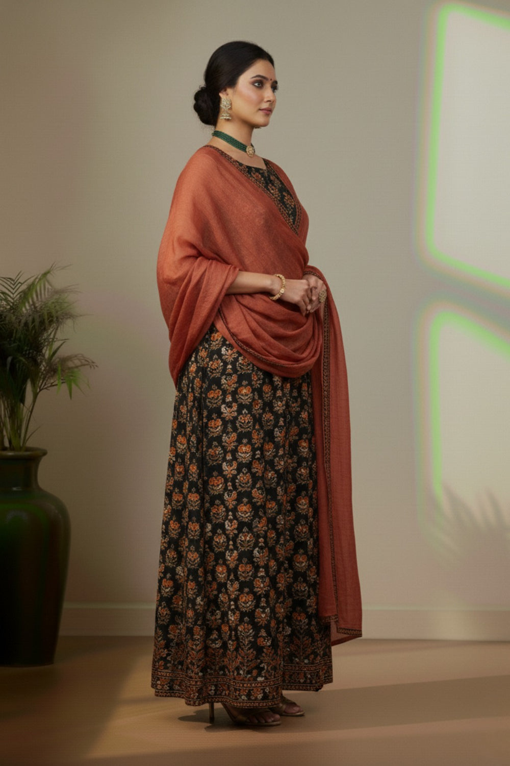 The combination of maroon and black cotton with floral prints and a delicate dupatta border creates a timeless, classic, and elegant traditional look.
