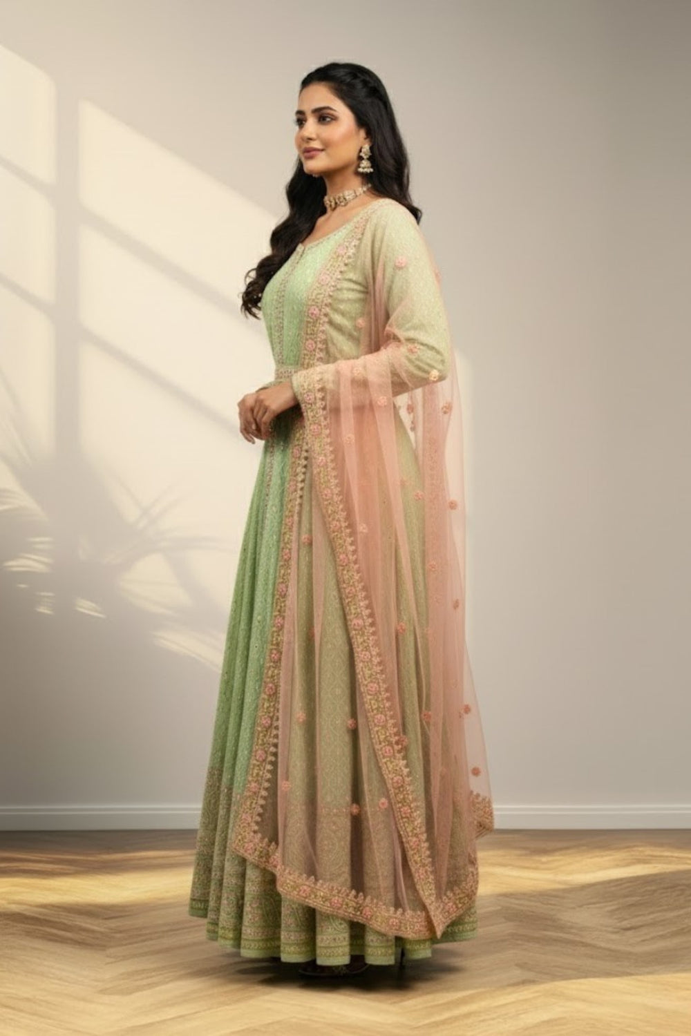 A pistachio green georgette suit designed with an elegant oval neckline and embellished with intricate all-over mirror work that brings a sparkling radiance. The perfect blend of grace and festive glamour, making it a versatile choice for special occasions.