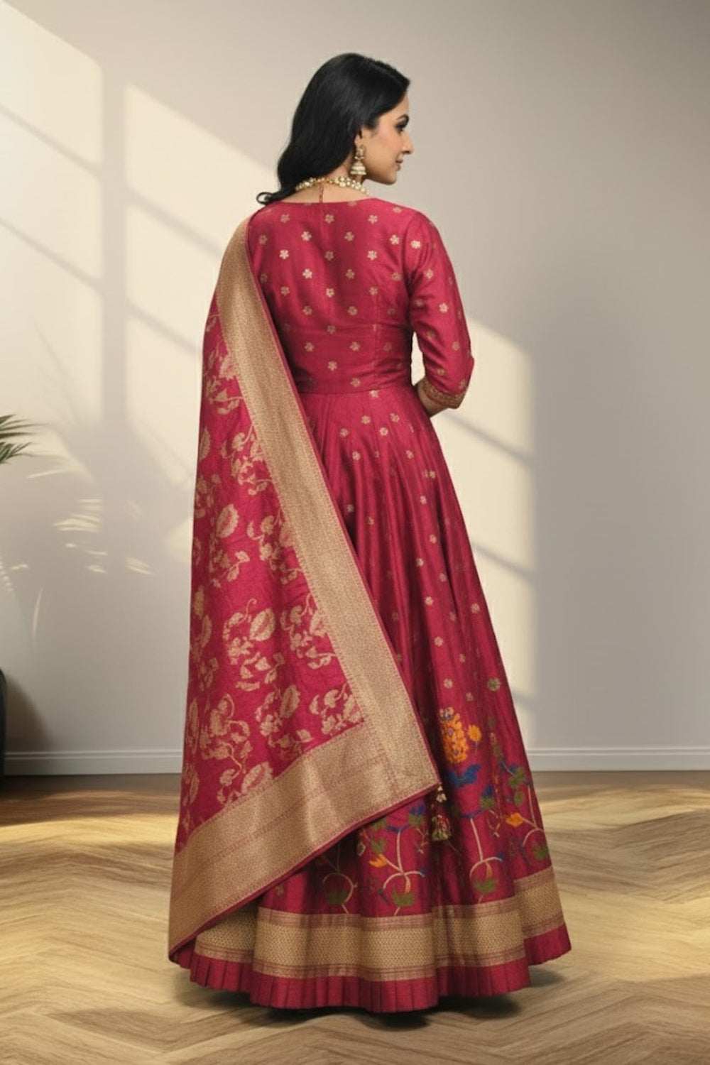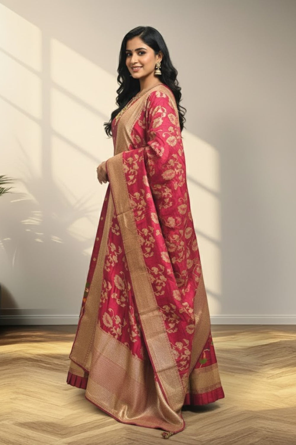 This elegant raw silk gown radiates traditional beauty with its intricate zari embroidery and rich ethnic detailing. Designed with a classic round neckline featuring a keyhole cut, the gown also includes full sleeves adorned with delicate floral prints. The look is completed with a statement dupatta featuring a wide embroidered border, adding grandeur and grace to the overall ensemble.