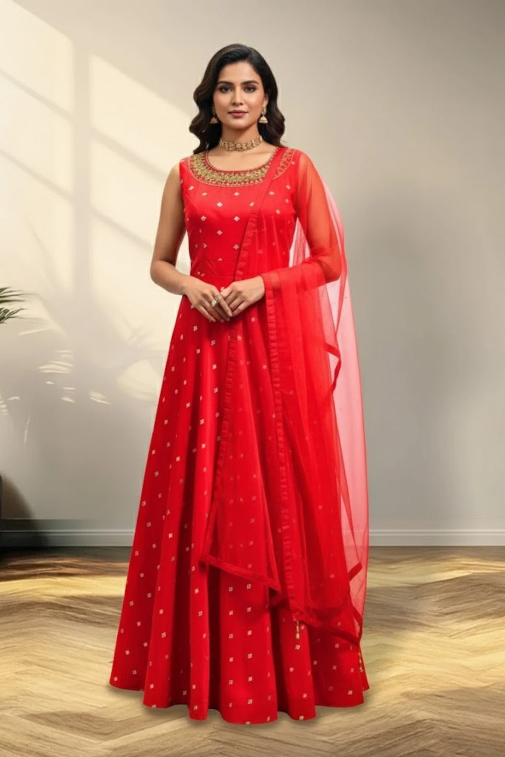 This gown is a perfect blend of modern cut and traditional glam, offering a radiant look for any special occasion.