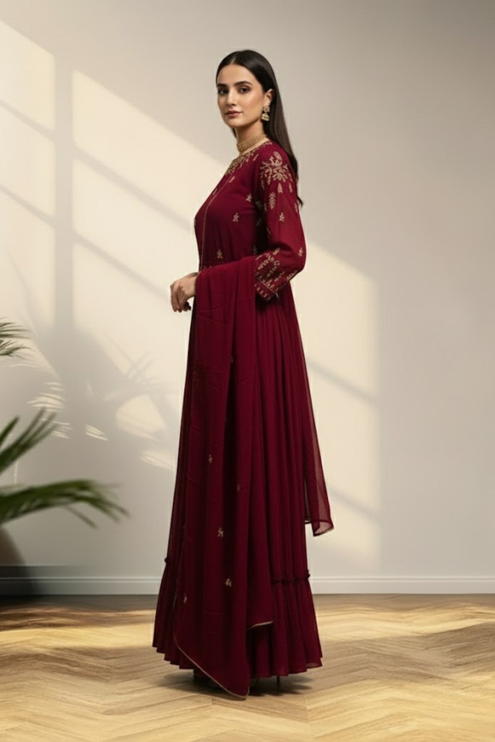 The rich magenta hue, paired with exquisite embroidery and a stone-embellished belt, makes this ensemble the epitome of graceful sophistication.