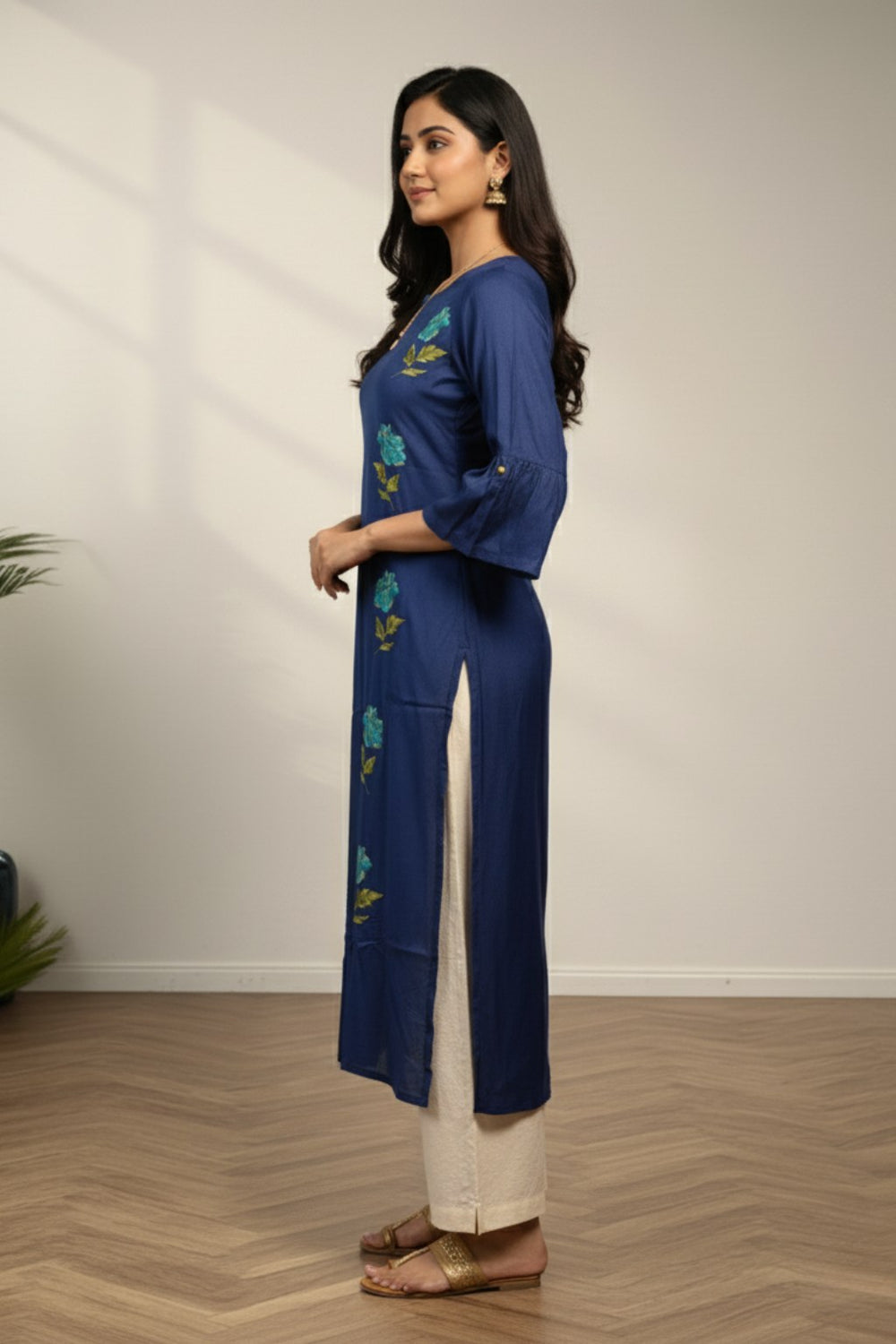 This elegant blue kurti set features a round neckline with a front keyhole opening, enhanced by delicate ice blue floral embroidery across the surface. A perfect choice for those seeking a sophisticated, traditional look with refined charm.