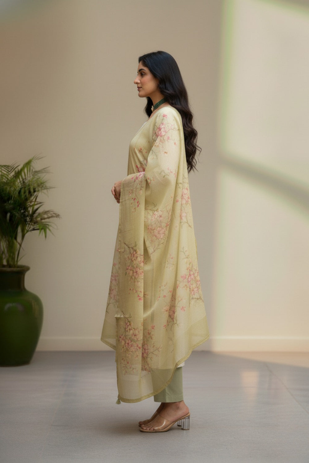 Pair with a matching or yellow-toned bottom and accessorize with delicate jewelry to enhance the freshness and elegance of the kurti and dupatta combination.