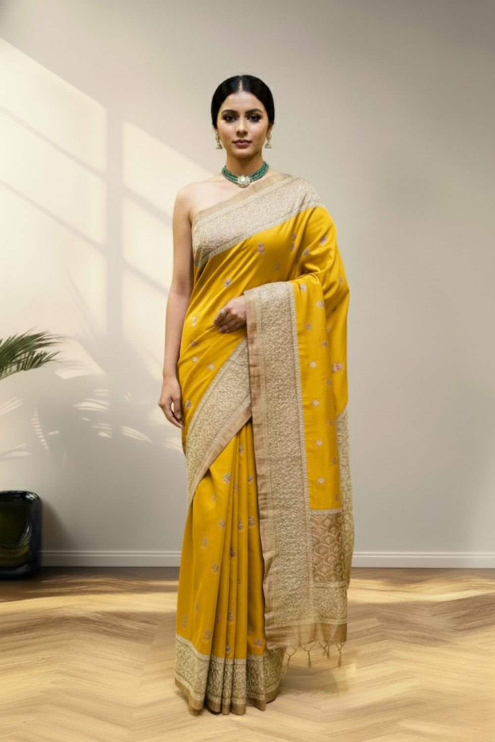 A radiant mustard yellow Banarasi silk saree adorned with delicate floral zari motifs and finished with a rich golden border and pallu, exuding timeless elegance.